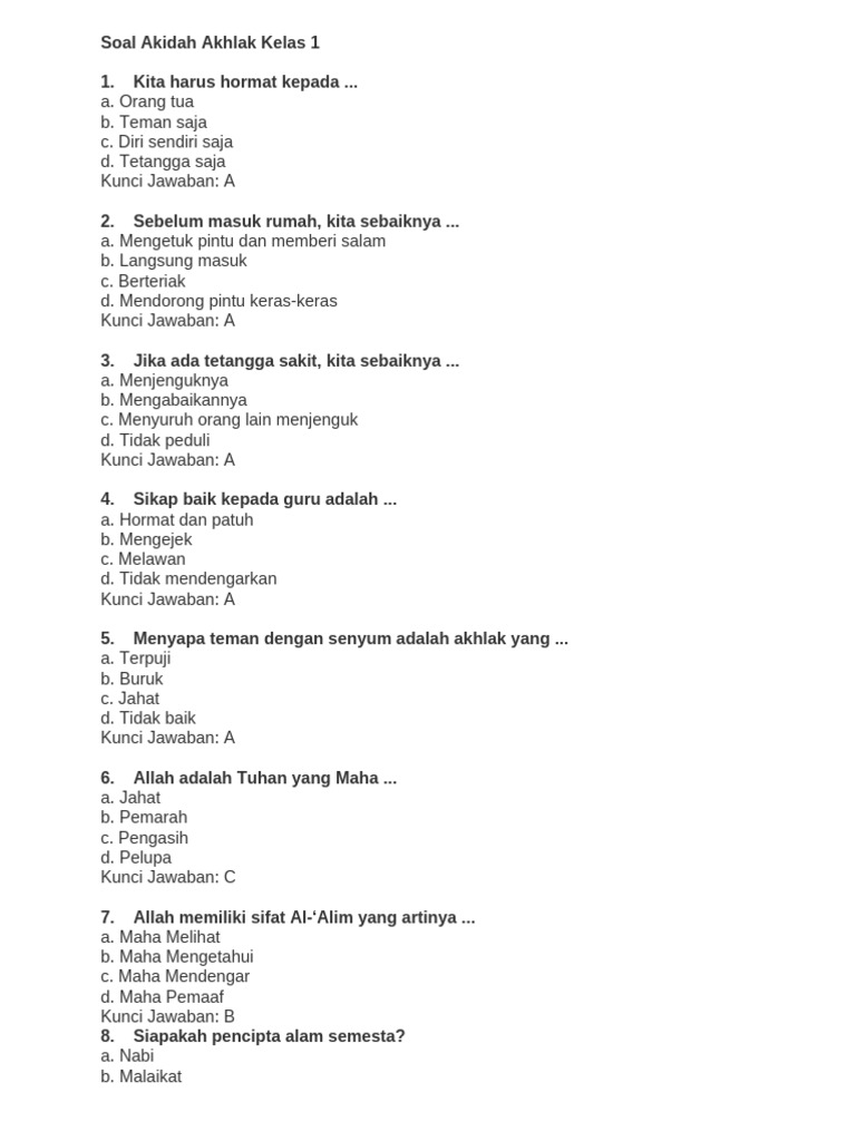 - Refleksi Kurikulum dan Pola Soal: Soal-soal UAS merupakan cerminan langsung dari kurikulum yang berlaku pada tahun tersebut. Dengan meninjau soal-soal dari tahun 2018, kita dapat melihat bagaimana materi Akidah Akhlak diajarkan dan diujikan kepada siswa Kelas 1. Pola pertanyaan, jenis soal (pilihan ganda, isian singkat, uraian), dan kedalaman materi yang diuji dapat memberikan gambaran yang jelas.