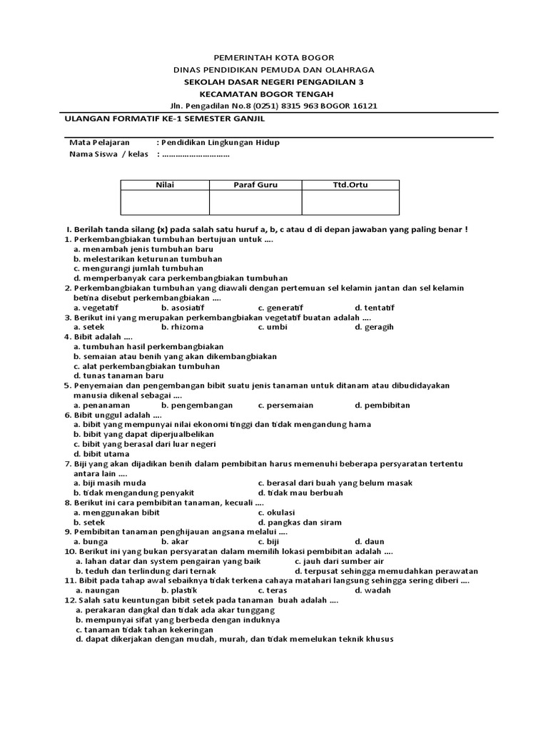 Pendidikan Lingkungan Hidup (PLH) memegang peranan krusial dalam membentuk generasi muda yang peduli dan bertanggung jawab terhadap kelestarian lingkungan. Di tingkat Sekolah Dasar (SD), khususnya kelas 6 semester 2, materi PLH semakin kompleks dan aplikatif. Artikel ini akan mengupas tuntas berbagai aspek soal PLH kelas 6 semester 2, mulai dari materi yang diujikan, contoh soal, hingga strategi belajar yang efektif. Dengan pemahaman yang mendalam, diharapkan siswa dapat menghadapi ujian dengan percaya diri dan yang terpenting, menginternalisasi nilai-nilai pelestarian lingkungan dalam kehidupan sehari-hari.