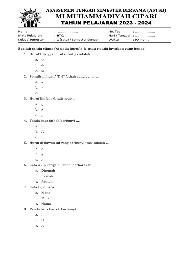Berikut adalah beberapa contoh soal BTQ kelas 1 semester 2 yang dapat digunakan sebagai referensi: